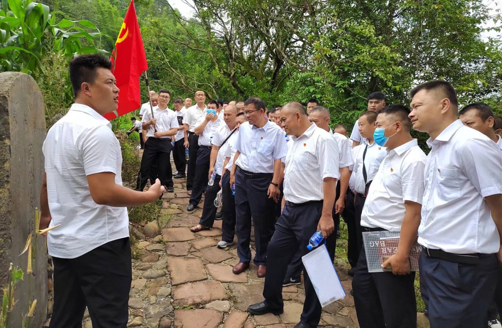 12:30,党员们乘车前往40公里外的谦岗村“方有富生平事迹陈列馆”开展党性教育。在谦岗村,党员们行走间领略了百年沧桑而不塌的茶马古道普洱段上保存最为完好的石台水面瓦房古桥风貌。在陈列馆,回顾聆听了“风华正茂、参加报国、退伍还乡、老骥伏枥、精神永存”的方有富生平事迹。真实的事迹、珍贵的实物,充分展现了方有富带头践行民族团结誓言,带领群众团结致富的大义之举,激励了党员们汲取奋发力量,切实把精神动力转化为为民办好事、办实事的强大动力。 在红色基地开展党性教育 在紧邻陈列馆的火塘夜校。党委书记、总经理李跃新讲授了《守初心、强信念、树正气 以实际行动喜迎党的二十大》主题党课,他紧紧围绕党的初心使命,结合分公司当前生产经营工作,从党员要如何加强党性锻炼、带头遵守纪律、加强道德品行修养、主动担当作为等方面进行了深刻的讲解。他强调:作为一名共产党员,要主动把巩固党史学习教育成果与岗位实践结合起来,把先锋模范作用体现在生产经营的每项工作任务中。要以“两学一做”为契机,提振精气神,为不断推动分公司发展作出更大的贡献,以优异成绩迎接党的二十大胜利召开。期间,全体党员重温了入党誓词。