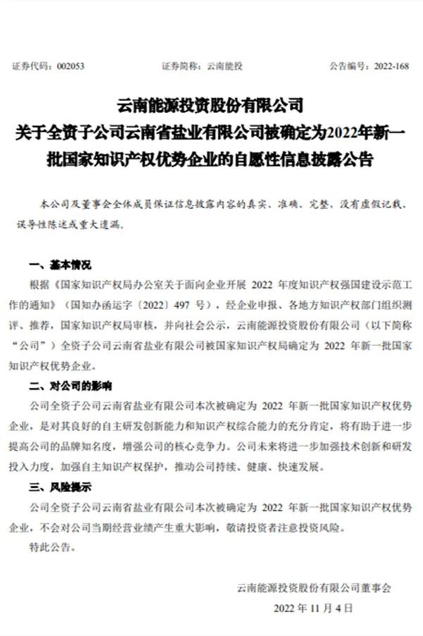 能投股份所属云南盐业首次通过国家知识产权优势企业认定