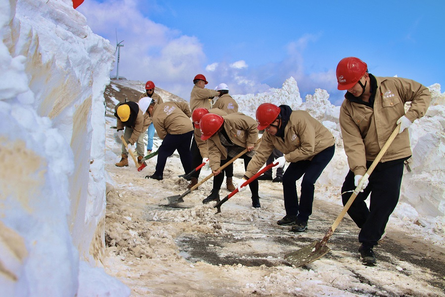 本网讯(通讯员邹茜报道)近日,大海梁子风电场多次出现大雪天气,气温最低零下8度,最大风速14.08m/s,最深处积雪达两米,风电场部分道路结冰严重,对风场运维造成较大的困难。为更好实现保安全促生产,会泽新能源公司党支部组织各支部党员组成突击队对进场道路开展“破...